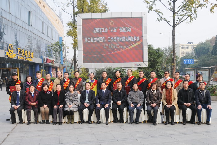 12月2日上午,市总工会在劳动人民文化宫广场隆重举行了成都市工会“六五”普法启动暨工会法律顾问、工会律师团成员聘任仪式。市总工会党组书记、常务副主席王建平,市司法局党组成员、副局长杨泽辉,省总工会法律工作部部长李长春等领导出席仪式。工会法律顾问委员会委员、工会律师团成员、市法律援助中心、市总机关各部门、市总帮扶中心、各区(市)县总工会(办事处)及我市部分职工代表共计300余人参加了活动。